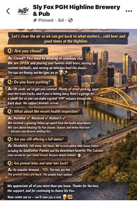 As of this writing SlyFox still remains present in Pittsburgh with their taphouse on Liberty Avenue. Continue to check back as more information is made available.